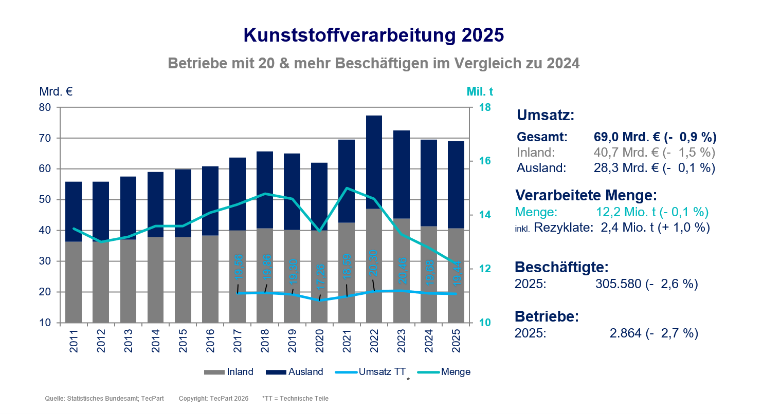 Stagnation als Lichtblick der Kunststoffverarbeitung im Jahr 2025. Nach dem Einbruch in 2024 flacht der Abwärtstrend ab, eine belastbare Trendwende bleibt jedoch aus. Der Markt verliert 0,9 % (69 Mrd. Euro), während technische Kunststoffprodukte am stärksten nachgeben (-2,4 % bzw. rund 0,5 Mrd. Euro). Die Bauindustrie als Frühindikator verzeichnet leichtes Wachstum (+0,5 %). Doch der Druck bleibt: Gewinne steigen nur bei 16 % der Unternehmen, 39 % bauen Personal ab; Beschäftigung und Zahl der Betriebe sinken weiter. Der Rezyklatverbrauch steigt minimal (+1 %).